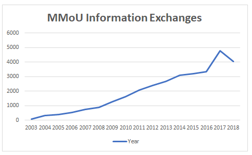 The chart below from IOSCO shows the growing number of MMoU information exchange requests over recent years across all signatory regulators: