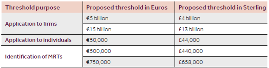 The FCA says that it would like to preserve the current proportionality threshold so far as possible and prevent additional complexity and cost for firms in scope. Further, a €15bn threshold better reflects the nature and size of dual-regulated firms in the context of the UK market. Note the FCA’s proposals on converting the CRD 5 financial thresholds form Euros to Sterling (discussed further below). Based on the FCA’s current proposals, the Sterling equivalents of the proportionality thresholds in CRD 5 would be £4bn (€5bn) and £13bn (€15bn).