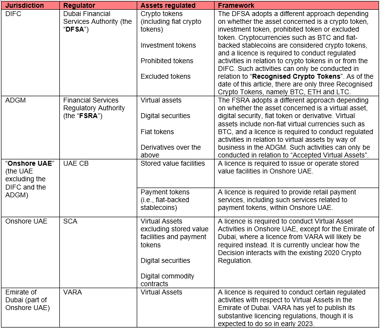While these clarifications are helpful, several questions still remain following the publication of the Decision. Perhaps what is most unclear is the impact of the Decision on the SCA’s existing Virtual Assets regulation, the Chairman of the Authority’s Board of Directors’ Decision No. (23/Chairman) of 2020 Concerning Crypto Assets Activities Regulation (the 2020 Crypto Regulation), which has been in effect for more than two years.